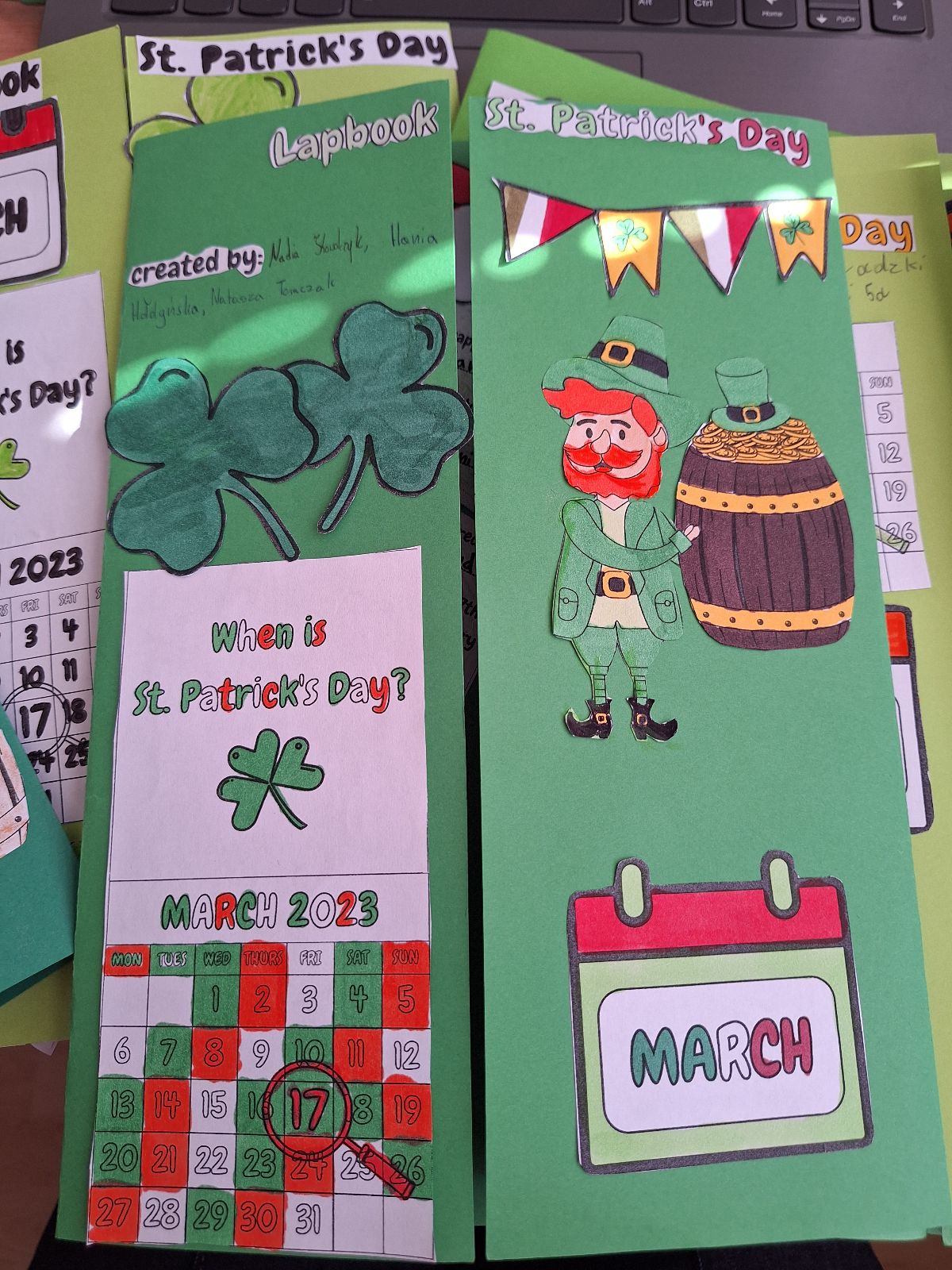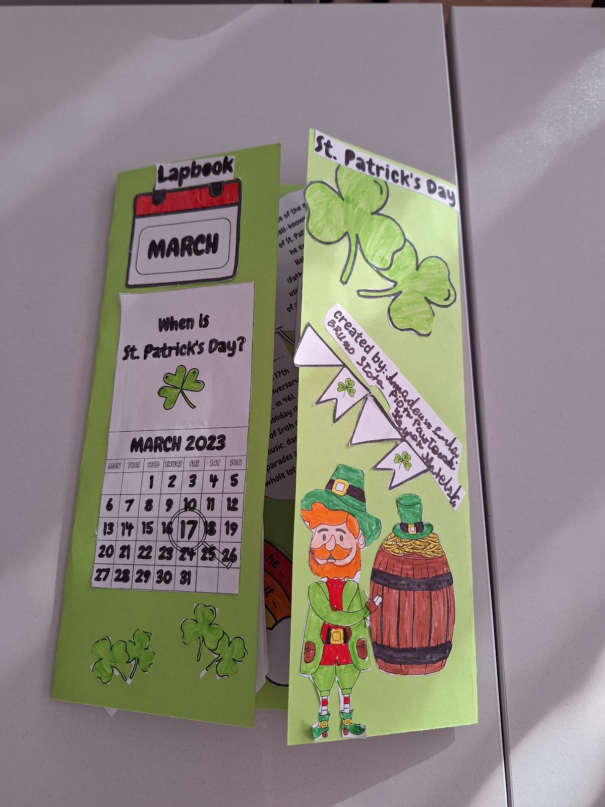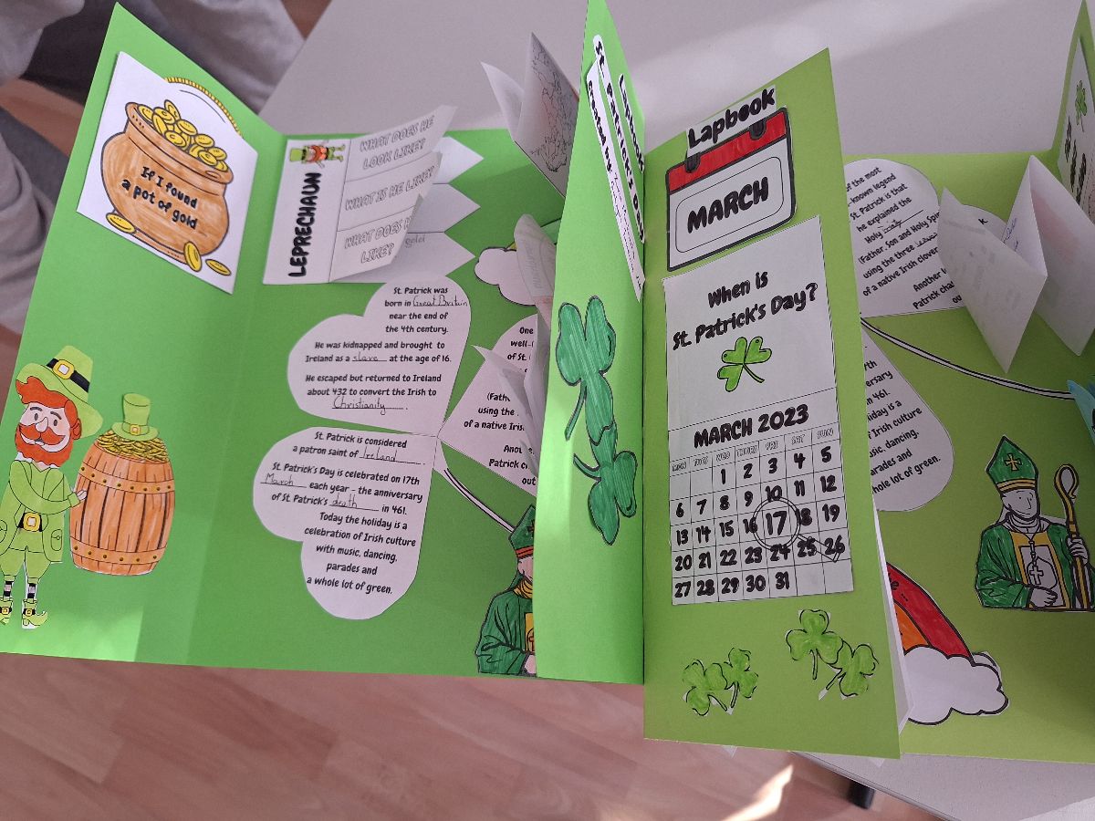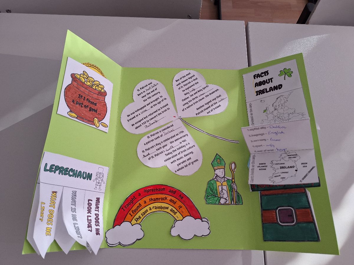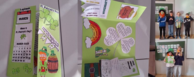 Najważniejszym elementem zajęć było przygotowanie przez uczniów lapbooków, czyli kreatywnych teczek tematycznych. Każda grupa w interesujący sposób przedstawiła informacje o tradycjach, zwyczajach oraz ciekawostkach związanych z Irlandią. Prace uczniów były bardzo pomysłowe, starannie wykonane i pełne interesujących treści.