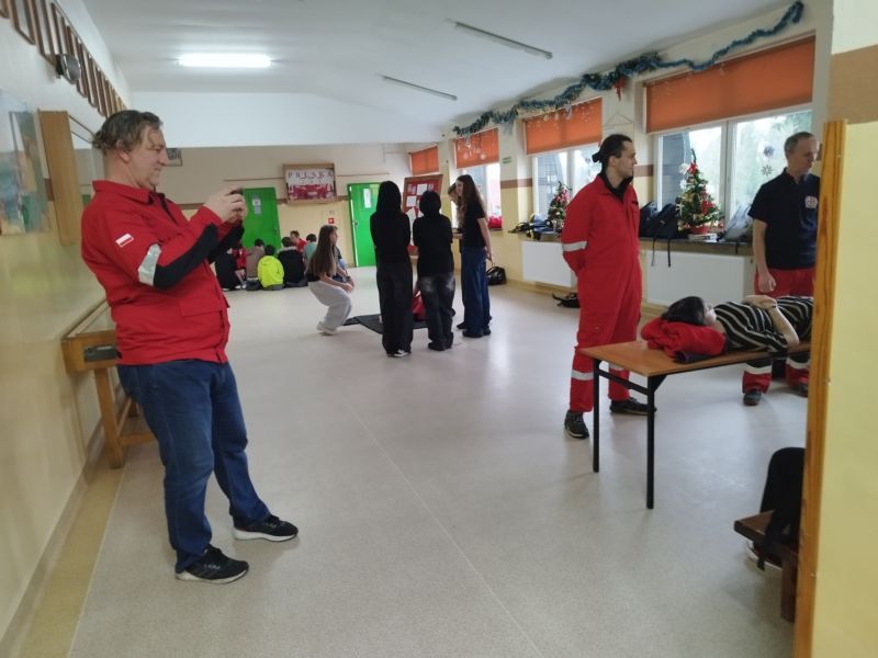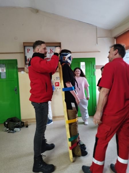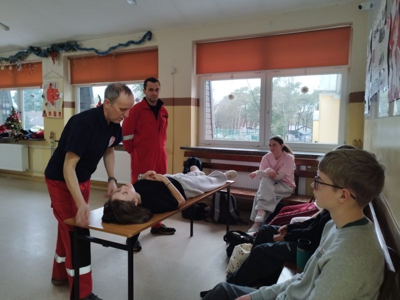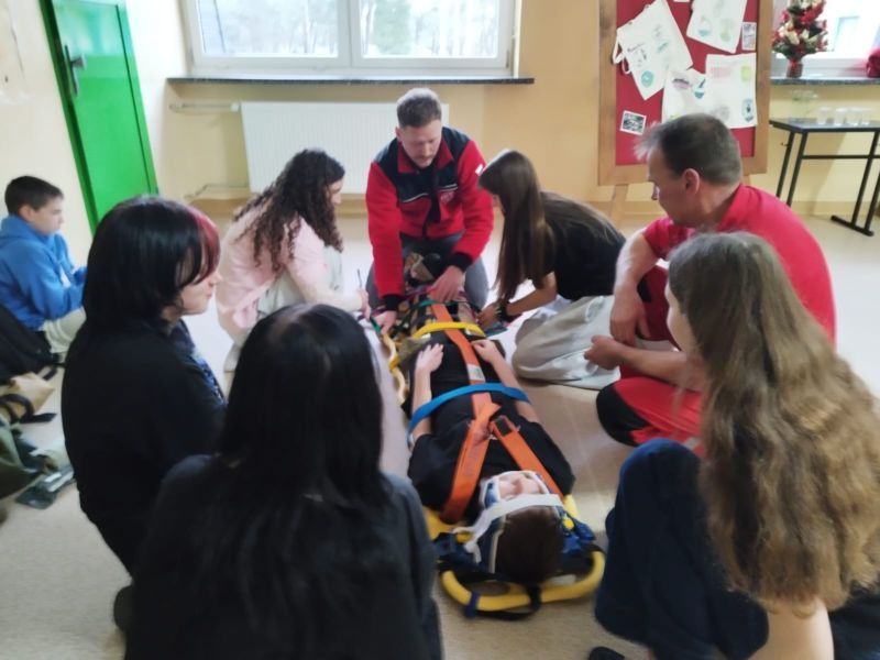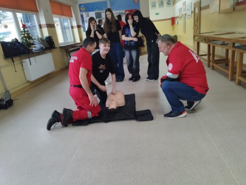 Pierwsze dotyczyło SAMPLE- schematu wywiadu medycznego stosowanego w ratownictwie podczas szkoleń i działań ratunkowych. Uczniowie dowiedzieli się, jak szybko i skutecznie zebrać najważniejsze informacje o poszkodowanym, uporządkować wywiad, ułatwić przekazanie informacji zespołowi medycznemu, skrócić czas działania w sytuacjach stresowych oraz zwiększyć bezpieczeństwo osoby poszkodowanej. Na drugim stanowisku uczniowie zdobywali wiedzę i umiejętności z zakresu resuscytacji krążeniowo-oddechowej