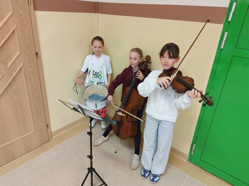 Muzyczne występy były kolejną niezapomnianą atrakcją! Uczniowie zaprezentowali swoje talenty instrumentalne: Urszula Kozicka – altówka, Hanna Hołdyńska – wiolonczela, Aurelia Mazurek – werbel. Ich występy wprowadziły wyjątkowy nastrój i były pięknym dopełnieniem