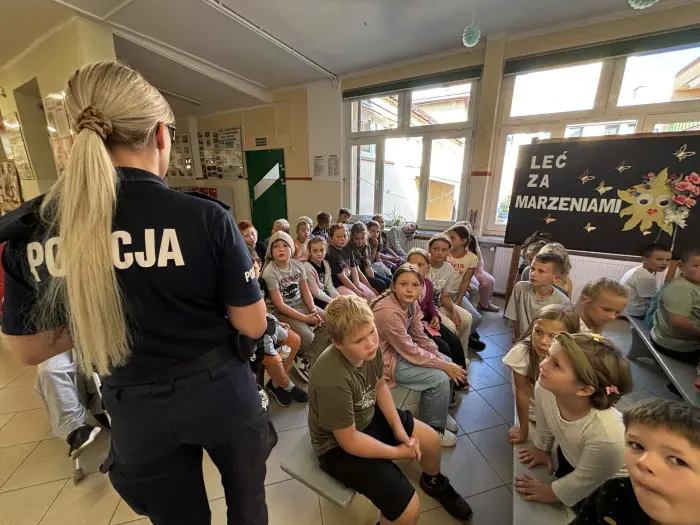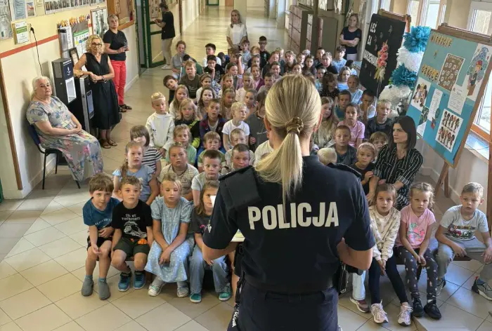 W pierwszej części spotkania st. sierż. Marta Szymańska przypomniała zasady bezpieczeństwa w szkole i poza nią. Policjantka rozmawiała z dziećmi o podstawowych zasadach bezpieczeństwa w ruchu drogowym, podkreśliła ważną rolę elementów odblaskowych, które każdy uczeń powinien posiadać. W trakcie rozmowy przypomniała dzieciom o bezpiecznej jeździe rowerem i jego wyposażeniu oraz o numerach alarmowych.