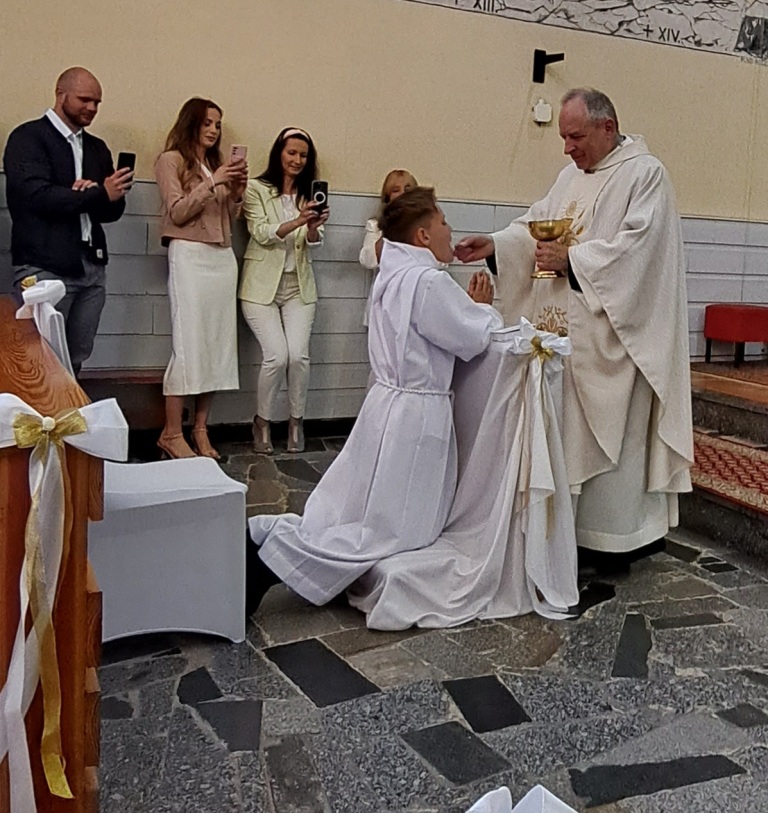 Także nasze dzieci z klas trzecich w tę sobotę- 13 maja w parafii św. Matki Bożej Różańcowej i w niedzielę – 14 maja w parafii św. Józefa w Dziwnowie po raz pierwszy przyjęły Najświętsze Ciało Pana Jezusa.