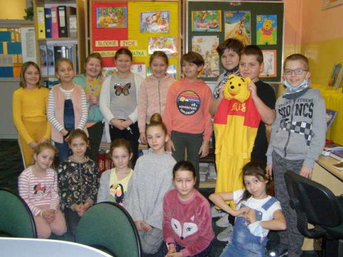 Z tej okazji uczniowie klas I-III wzięli udział w zajęciach czytelniczych w bibliotece szkolnej. Dzieci poznały historię powstania książek o Kubusiu Puchatku, rozwiązywały quiz ze znajomości przygód Puchatka i jego przyjaciół, zaśpiewały „puchatkową” piosenkę, poczęstowały się także „małym conieco”.