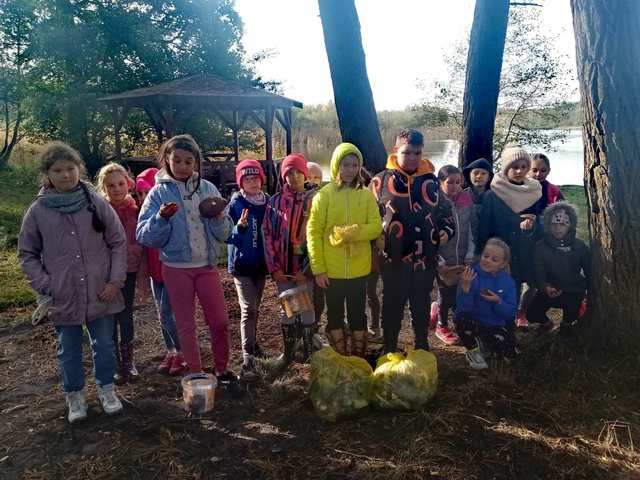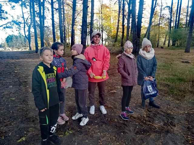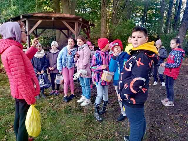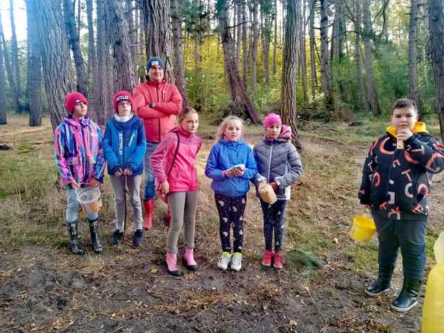 Korzystając z pięknej jesiennej aury klasa 4a wybrała się podczas dwóch lekcji wf-u na grzybobranie do lasku nad jezioro Martwe. Zbyt wiele grzybów nie nazbieraliśmy, bo sezon na grzyby na naszym terenie już się kończy, ale dzieci miały dużo frajdy. Przy okazji nazbieraliśmy 3 worki śmieci – zostawiliśmy lasek czyściuteńki. Podczas wyprawy do lasu, nad bezpieczeństwem uczniów podzielonych na małe grupy, czuwali rodzice. Dziękujemy babci Vitaliny, mamie Kuby i Neli oraz tacie Alana za pomoc w opiece nad dziećmi podczas przejścia ulicami i pobytu w lesie. Pani Łosz dodatkowo dziękujemy za wspaniałe zdjęcia z wyprawy