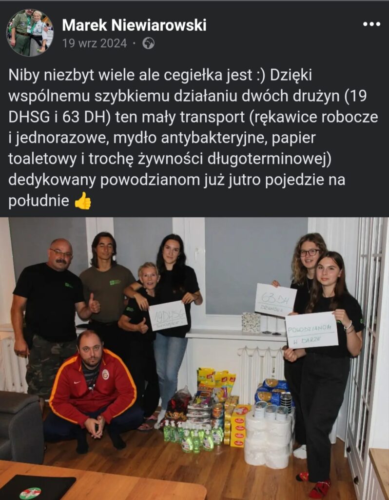 przesłali potrzebującym 9 par kaloszy/gumowców oraz 110 par rękawic do prac porządkowych po powodzi. Przekazali również kwotę 500 zł, za którą zakupione zostały i zawiezione przez harcerzy ze Świnoujścia produkty spożywcze.