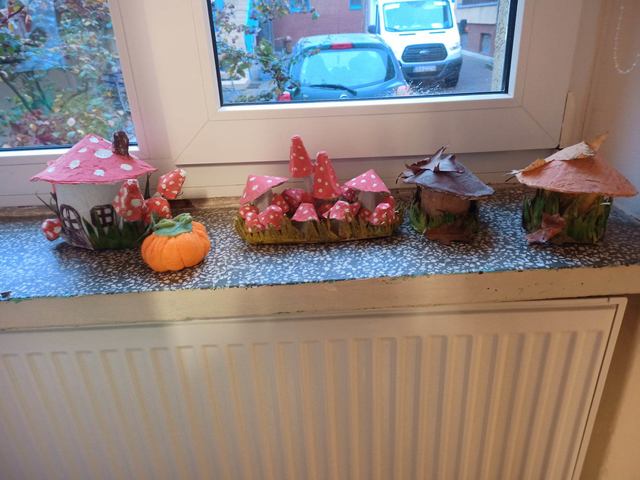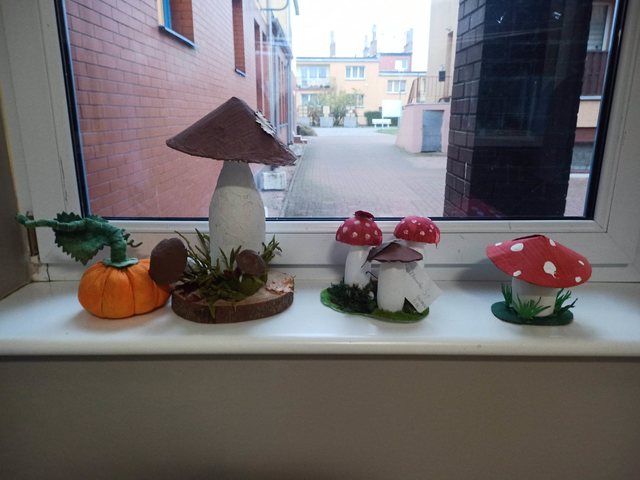 Niebawem pożegnamy panią Jesień, która swoimi darami i ciepłymi barwami przez 2 miesiące upiększała szkolne korytarze. Wraz z dziećmi z klasy 5a ubraliśmy stary manekin znaleziony na śmietniku w kolorowe szmatki i przyozdobiliśmy liśćmi i owocami, a okna udekorowaliśmy łącznie ponad 200 grzybami wykonanymi przez uczniów z materiałów z recyklingu. Już niedługo stary manekin sklepowy, który otrzymał drugie życie zmieni klimat w szkole na przedświąteczny. Uczniowie niczym elfy już drugi tydzień, wytwarzają nowe ozdoby. Dziecięce rękodzieło z pewnością będzie jak zwykle urocze i sprawi ich twórcom wiele radości.