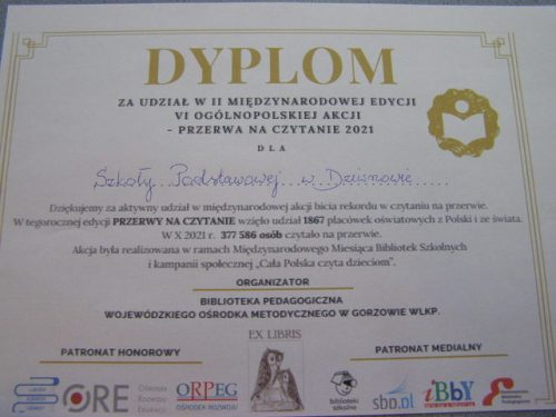 Wydarzenie to odbyło się w ramach II Międzynarodowej edycji VI Ogólnopolskiej Akcji Bicia Rekordu w Czytaniu na Przerwie “Przerwa na czytanie”, organizowanej przez Bibliotekę Pedagogiczną Wojewódzkiego Ośrodka Metodycznego w Gorzowie Wlkp.