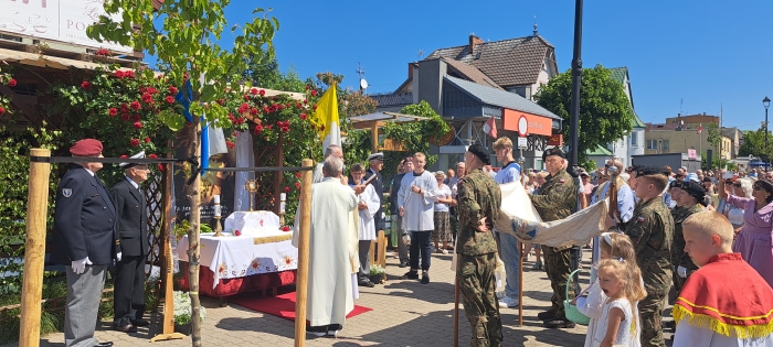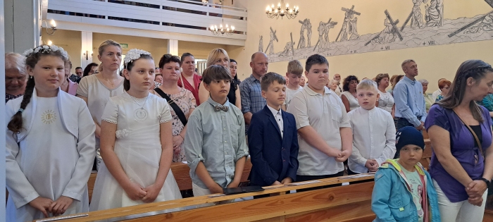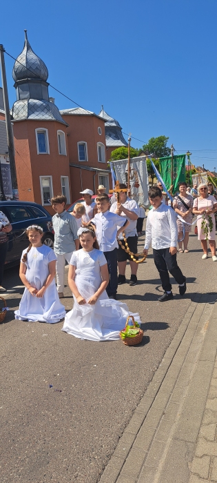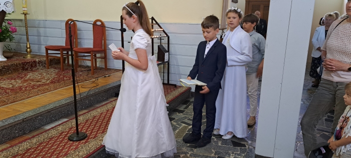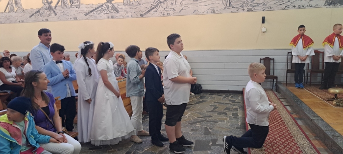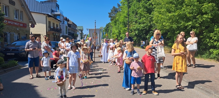 Dzieci z klas czwartych, które przyjęły w zeszłym roku I Komunię Świętą w parafii św. Józefa w Dziwnowie, swoją rocznicę świętowali w Uroczystość Bożego Ciała 8 czerwca 2023r.