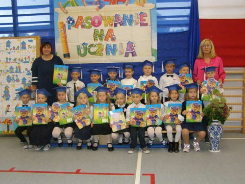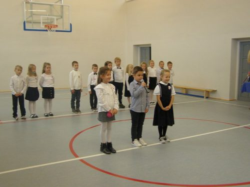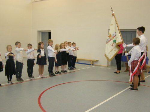 W tym dniu pierwszaki odświętnie ubrane, z przypinką Kocham Polskę, po „zaliczeniu testów” ze śpiewania hymnu, piosenek patriotycznych oraz testu z przepisów ruchu drogowego, znajomości poznanych liter, liczb i figur geometrycznych oraz recytacji wierszy w obecności rodziców i Pani dyrektor złożyły uroczyste ślubowanie przy sztandarze szkoły. Uczniowie ślubowali być dobrym Polakami, dbać o dobre imię szkoły i swojej Ojczyzny, swym zachowaniem i nauką sprawiać radość rodzicom i nauczycielom.