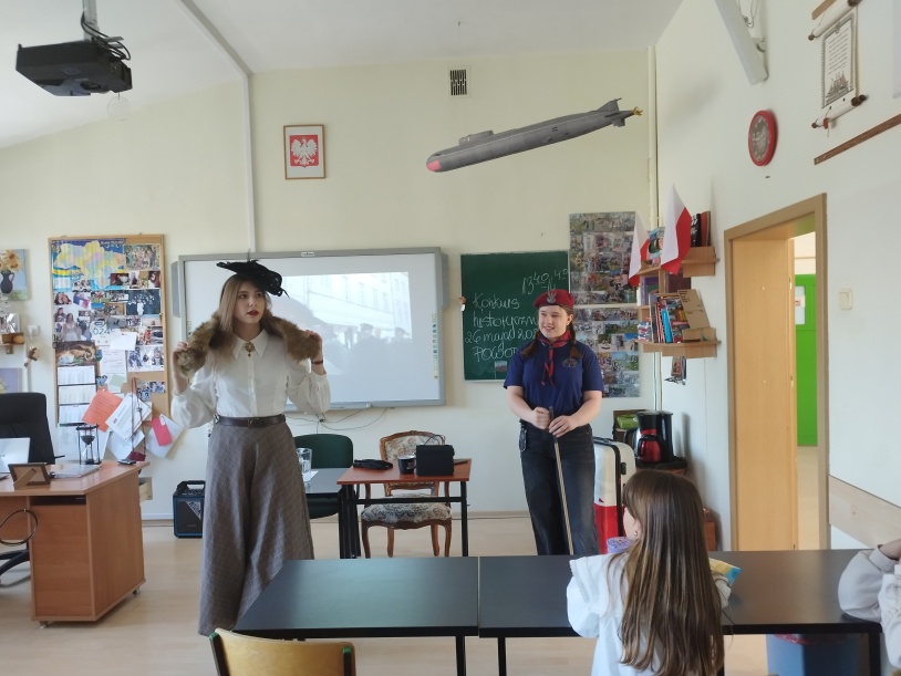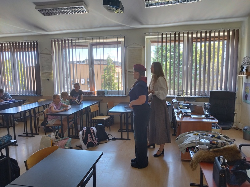 Gościliśmy byłe harcerki 63. Drużyny Harcerskiej „Szare Szeregi” im. Henryka Kończykowskiego ps. „Halicz” w Dziwnowie: Magdalenę Sadowską i Gabrielę Kozłowską. Obecnie są one aktywnymi członkiniami Oddziału Terenowego Grupy Historycznej w Głogowie, a na co dzień uczennicami klas ósmych Szkoły Podstawowej im. 5-go Kołobrzeskiego Pułku Piechoty w Dziwnowie. Dziewczęta w niezwykle ciekawy sposób opowiedziały o mundurach