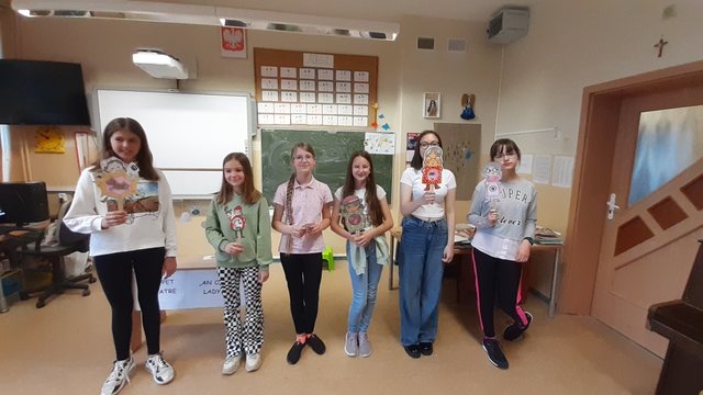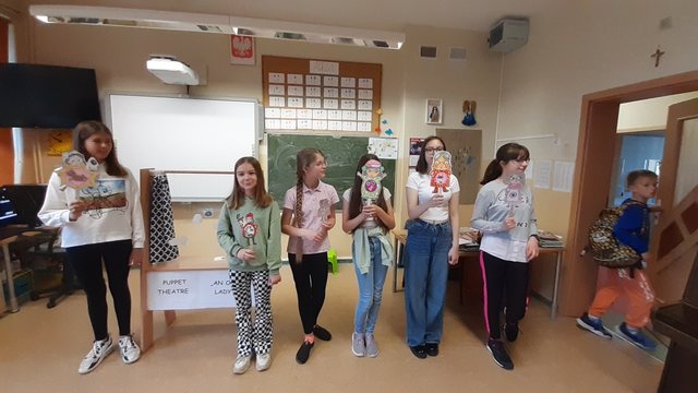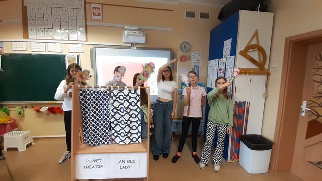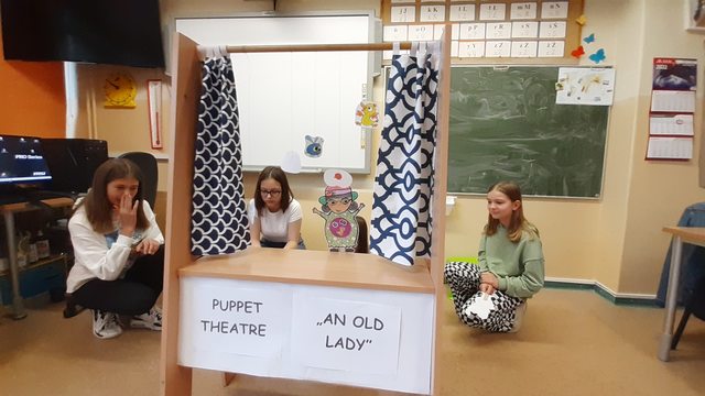 Uczennice klasy 5a i 5b, uczęszczające na dodatkowe zajęcia z języka angielskiego, przygotowały mini teatrzyk kukiełkowy pt. „There was an Old Lady who Swallowed a Fly”. Maja, Zosia, Ola, Iza, Lena i Magda (z małą pomocą Oli S. oraz Julii M. z kl.7a) same przygotowały swoje kukiełki, nauczyły się ról po angielsku i z wielkim entuzjazmem wystąpiły przed uczniami klas 1 i 2. Był to ich teatrzykowy debiut, w którym mogły sprawdzić swoje umiejętności językowe, a także aktorskie. Dziewczynki spisały się znakomicie, o czym świadczyły brawa widzów.