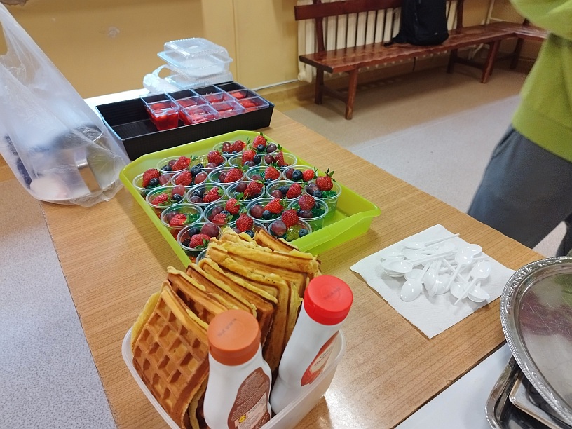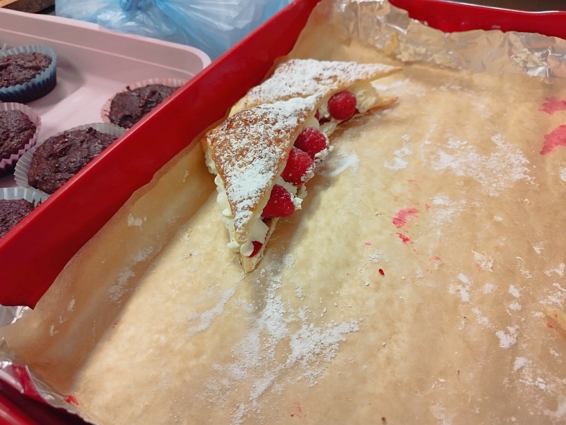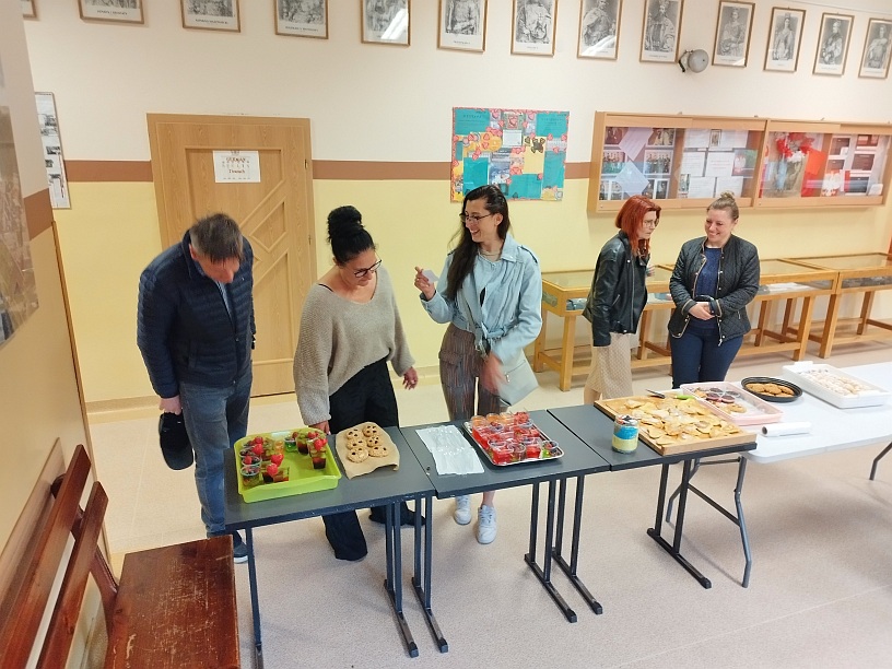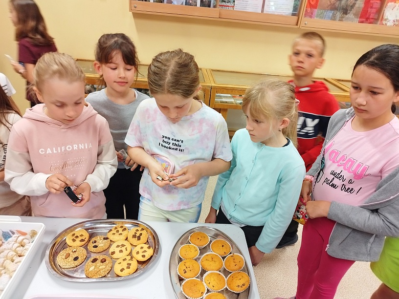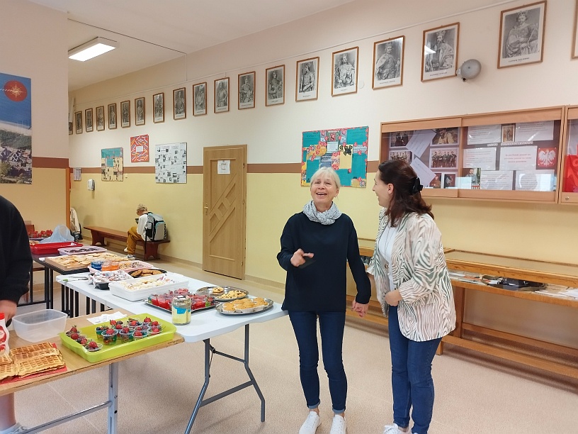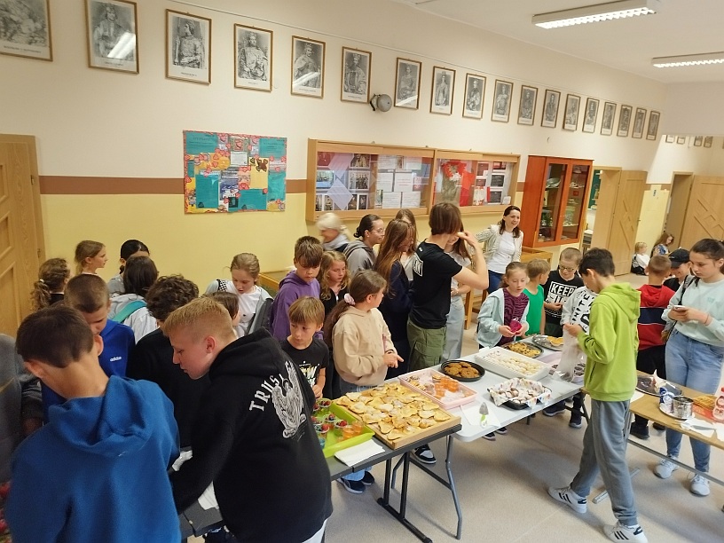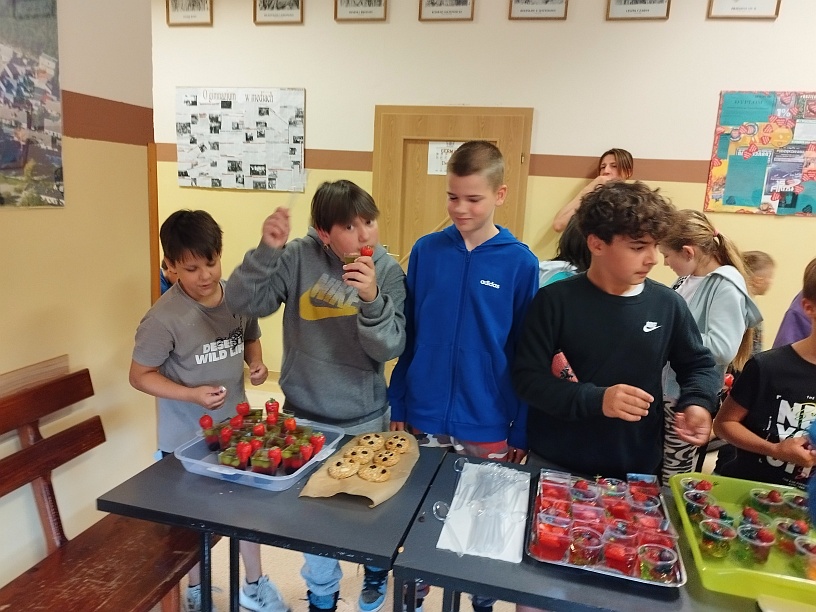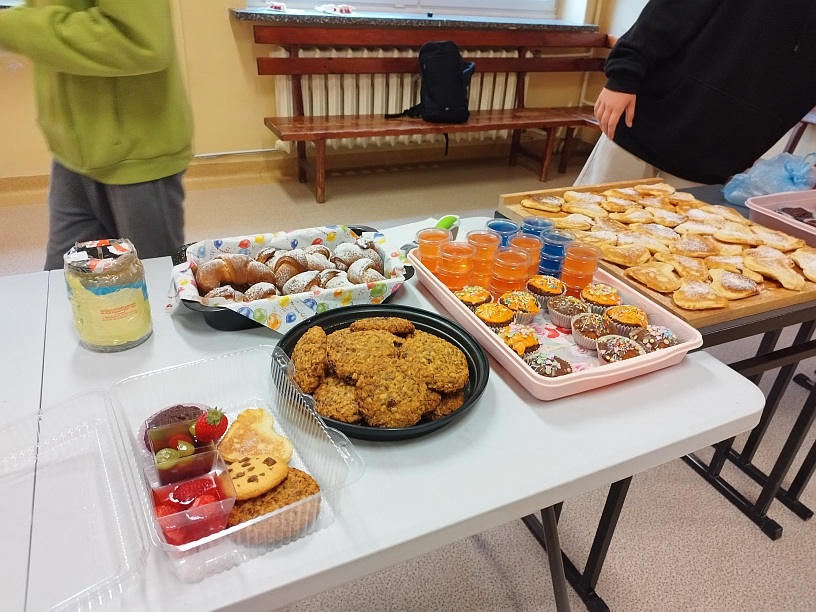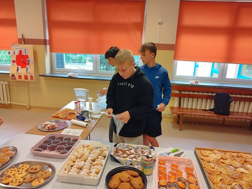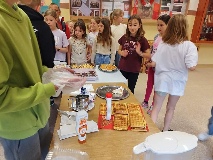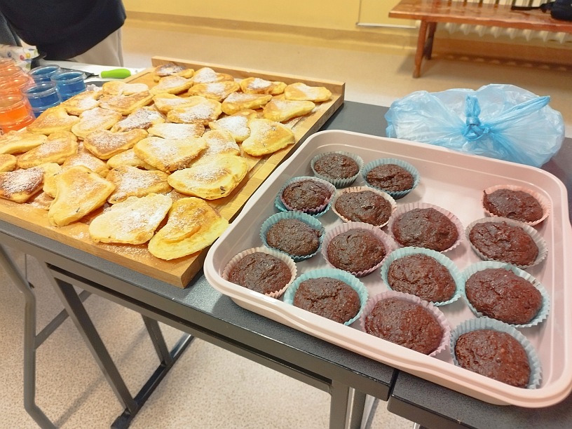 z realizacją projektu „Źródła historyczne w moim domu”. Natomiast w naszym sklepiku ze słodkościami sprzedawaliśmy: racuchy w kształcie serca, rogaliki, ciasteczka, w tym także owsiane, galaretki z owocami, gofry, babeczki , ciastka z bitą śmietaną i malinami (patrz zdjęcia). I tutaj ogromne podziękowania dla Rodziców i Uczniów cukierników. Starałam się