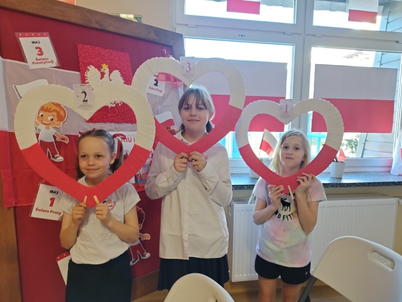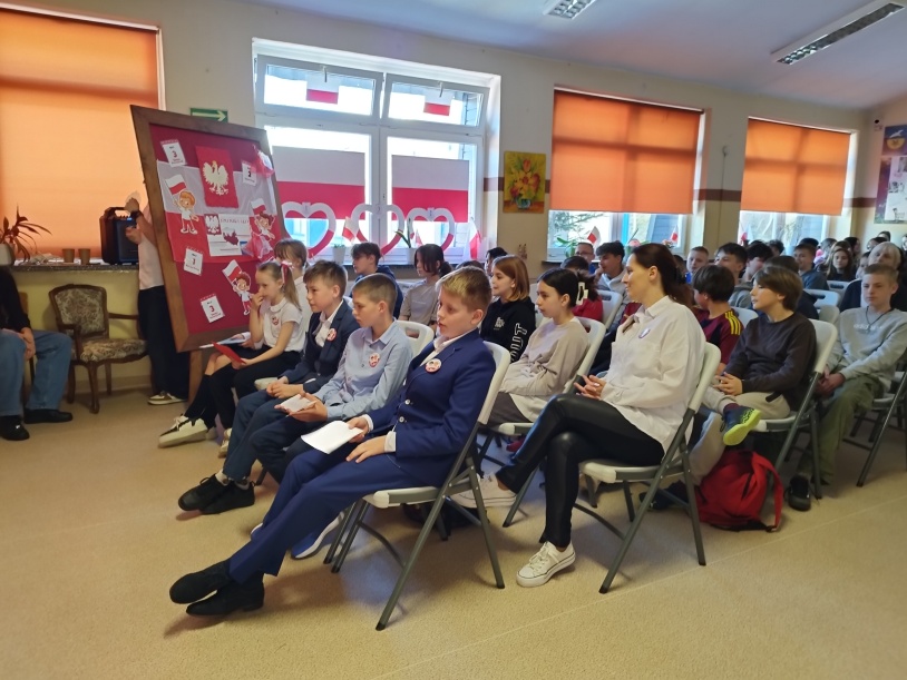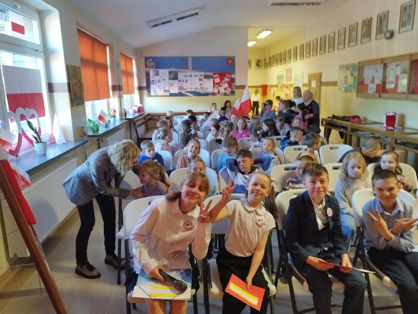 ozdobiona motywami narodowymi. Za jej wykonanie ogromne podziękowania składam pani Iwonie Gliczyńskiej. Patriotyczne serca – symbole miłości do Ojczyzny dodawały zdjęciom ciepła i emocjonalnego wymiaru przypominając, że patriotyzm może być radosny, serdeczny i bliski każdemu z nas. Wraz z panią Kamilą Bieć zagwarantowałyśmy uczniom klasy 4a patriotyczne przypinki, a wszystkim uczniom szkoły naklejki patriotyczne. Dzieci-widzowie